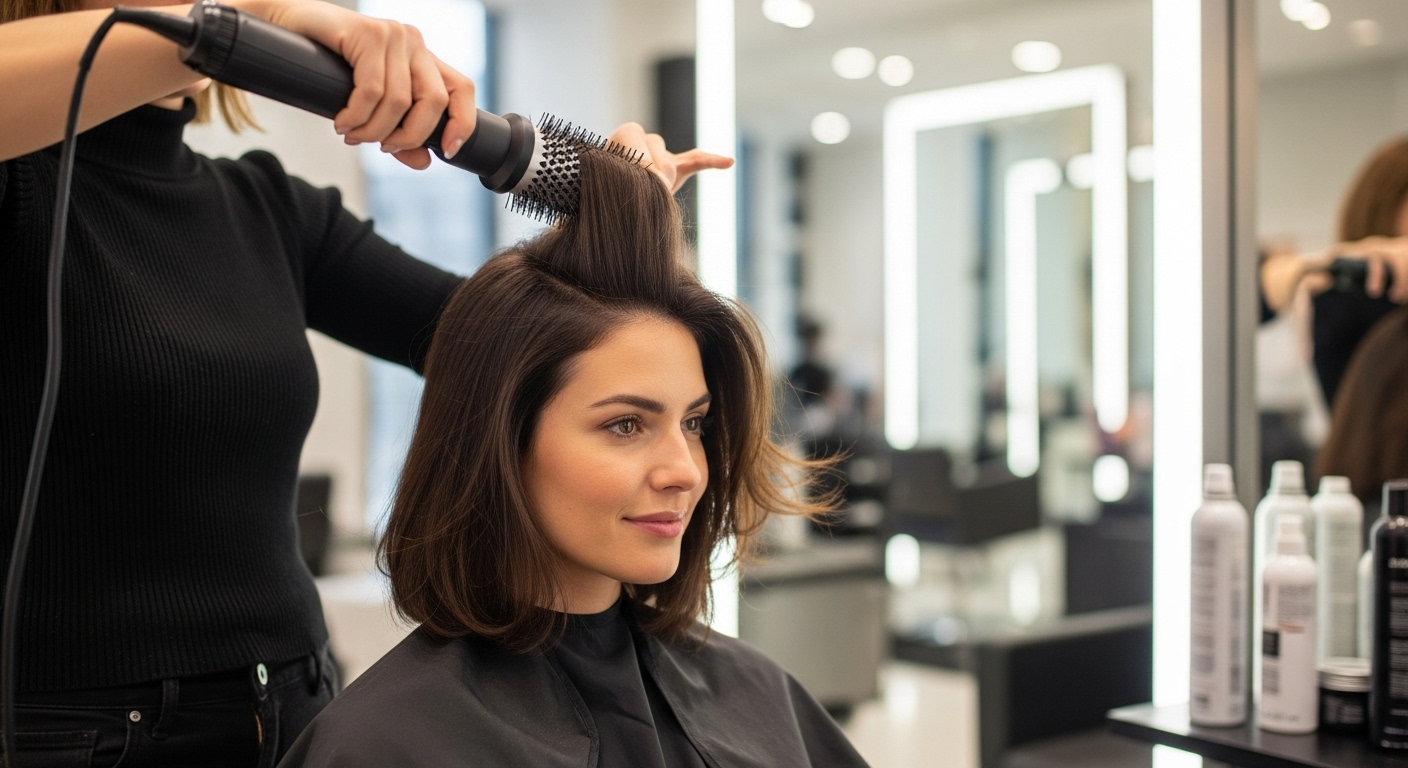O segredo é escolher produtos leves e aplicá-los estrategicamente. Um bom protetor térmico é indispensável, seguido por um mousse ou spray volumizador focado na raiz. Isso prepara o cabelo para receber o calor da escova rotativa e sustentar o volume.